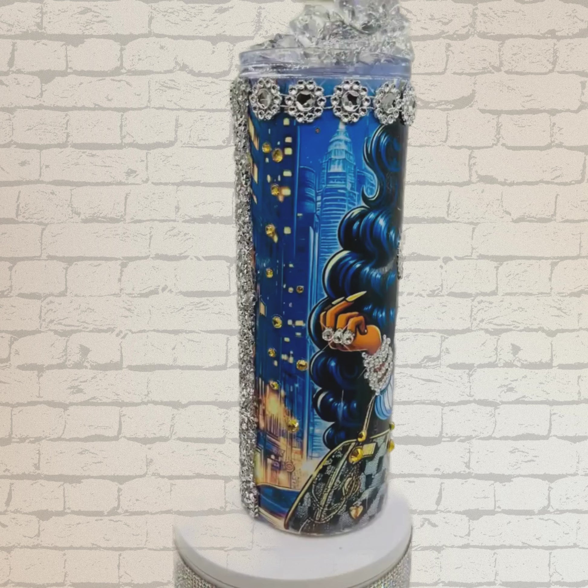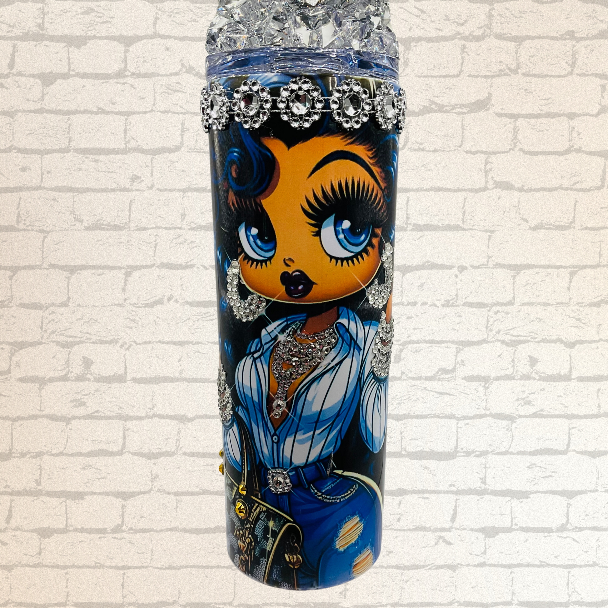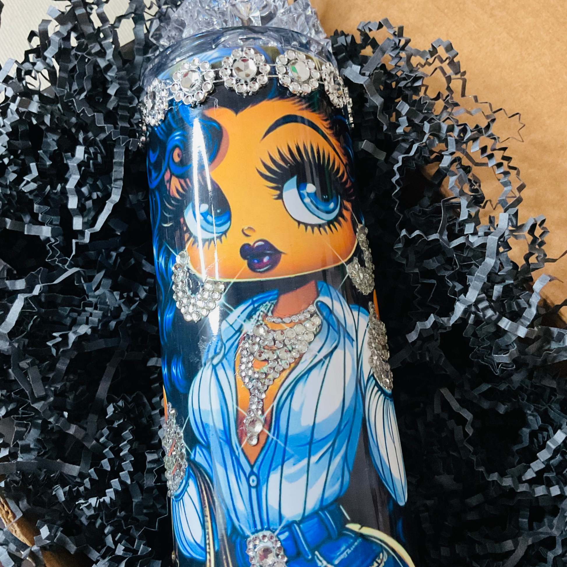 Command the room (and your coffee break) with the Boss Babe Bling Tumbler – a bold 20oz stainless steel cup featuring a fierce cartoon fashionista in blue denim and rhinestone-studded jewelry. Hand-embellished with sparkling gems and chic details, this tumbler is a must-have for women who slay every sip in style.
