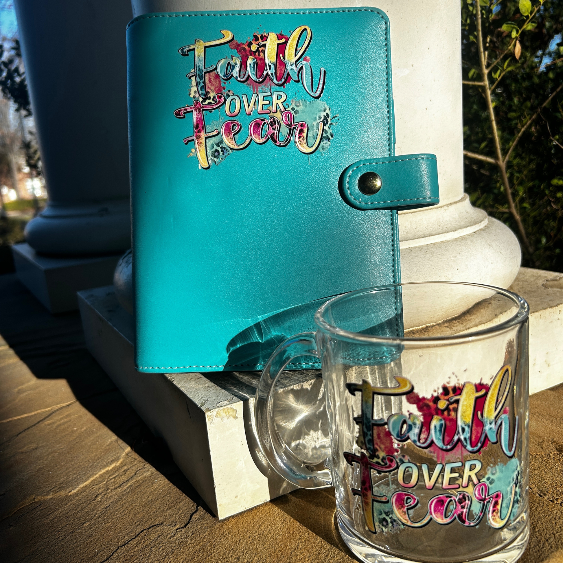 Let your faith speak louder than your fear with this beautiful Faith Over Fear bundle—designed for the bold, the prayerful, and the women walking by faith. This colorful duo features an empowering, splattered watercolor-style design on both a clear glass mug and teal faux leather planner binder.