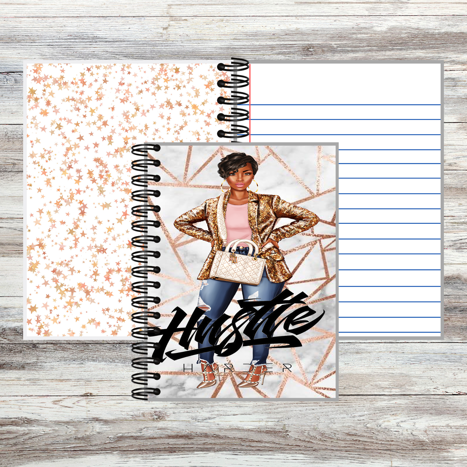 "Fuel your ambition with the Her Hustle Notebook. Designed for the go-getter, this stylish notebook is perfect for jotting down goals, plans, and ideas. Ideal for women who hustle hard and stay organized on their path to success."