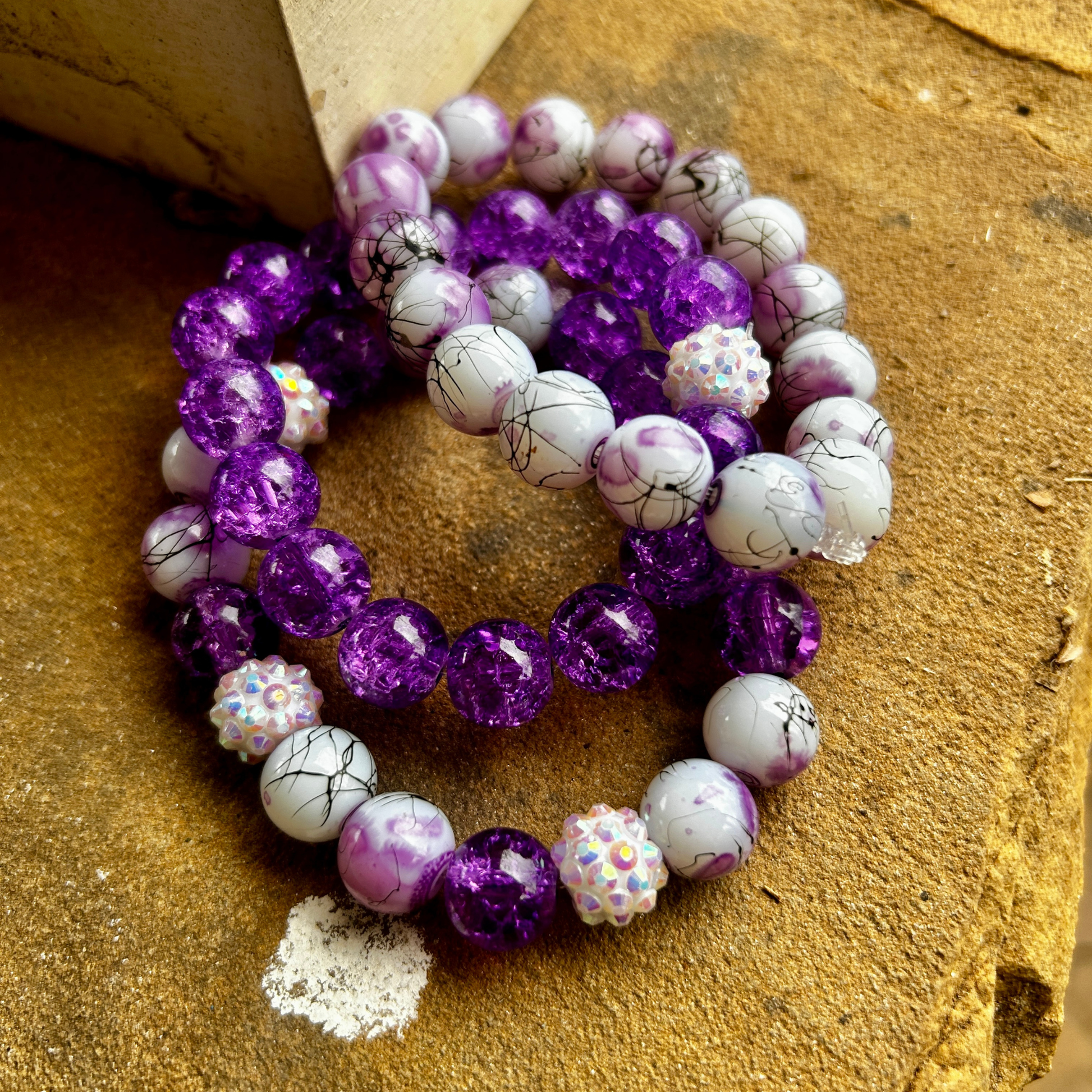Royal Radiance Beaded Bracelet Set – Purple Crackle & Marble Swirl
